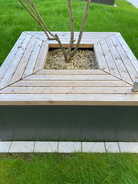 - Holz-Sitzbank in die Gefäße integriert, ideal zum Verweilen