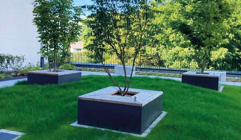 Rechteckige Pflanzgefäße für Großsträucher und kleinere Bäume, integriert in einen angehügelten, substratbasierten Dachgarten. Das maßgefertigte Hydro Profi Line® System sorgt für eine pflegeleichte Bewässerung und nachhaltige Pflanzengesundheit. Integrierte Holz-Sitzgelegenheiten laden zum Verweilen ein.